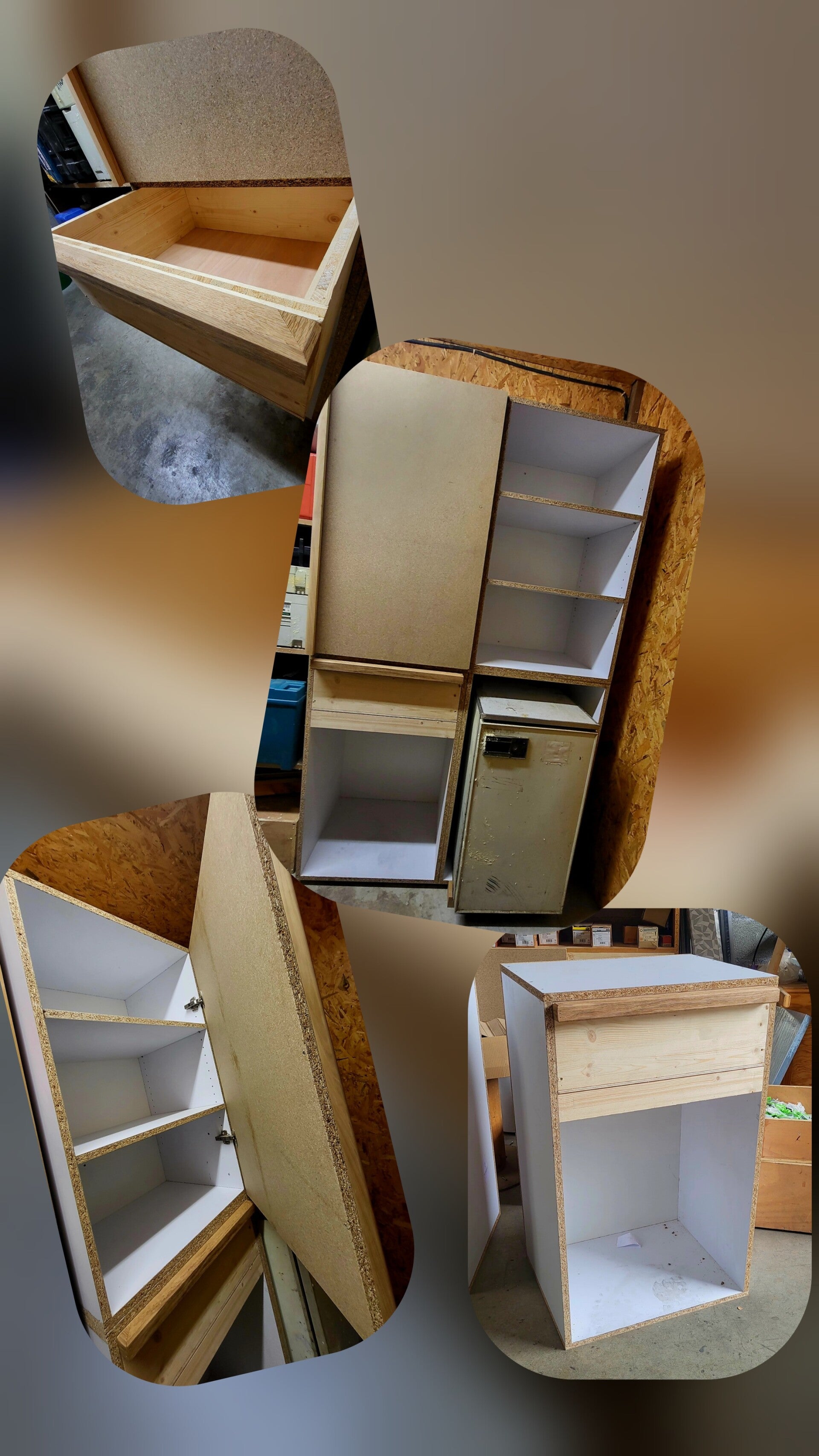 Fabrication d'un meuble en méla sur mesure avec 2 placards avec des étagères à l'intérieur, 1 tiroir en 3 plis EPICEA et un caisson pour mettre le frigo au travail.